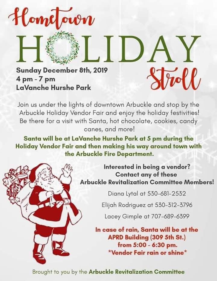 Join the community in a hometown event to celebrate the holidays with each other on Sunday, December 6th from 4 pm to 7 pm at LaVanche Hursh Park, in the heart of Arbuckle.